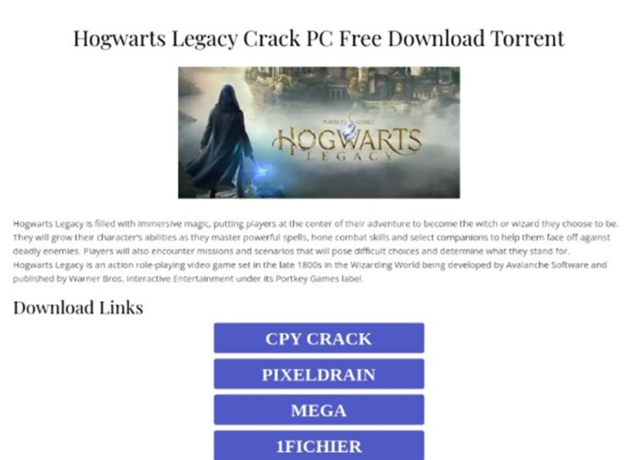 Olağanüstü satış rakamlarına ulaşan, efsanevi büyücülük dünyasında geçen oyunun dünya çapında milyonlarca hayranı bulunuyor. Oyunun henüz piyasaya bile sürülmediği günlerde, Kaspersky araştırmacıları PC’de “Hogwarts Legacy” indirme olanağı sunan çok sayıda site örneğini buldu. Oyuncular, crack’li bir oyunu indirmeye çalışırken aslında cihazlarına kötü amaçlı veya istenmeyen yazılım indirdiler. Yayılan programlar, kullanıcının ekranına reklamlar çıkartan reklam yazılımlarından, kullanıcı hakkında sessizce bilgi toplayan truva atlarına kadar değişebiliyor.